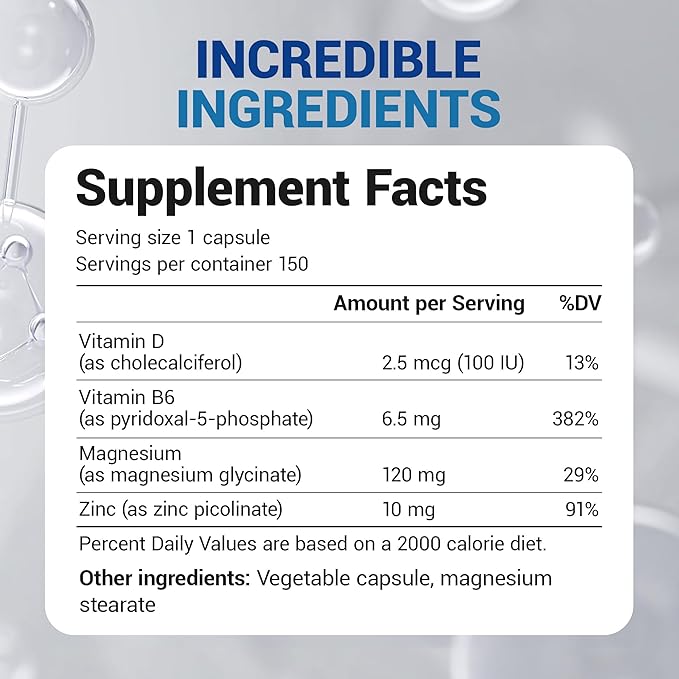 - Extensively researched formula: Features four powerful key ingredients: magnesium, vitamin B6, vitamin D3 and zinc with 120 mg of magnesium glycinate, 6.5 mg of vitamin B6, 100 IU of vitamin D3, and 10 mg of zinc per magnesium glycinate capsule.