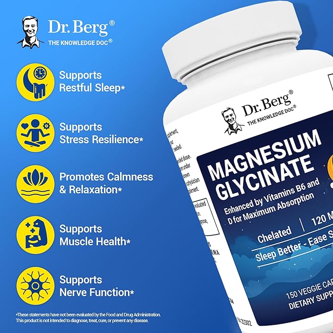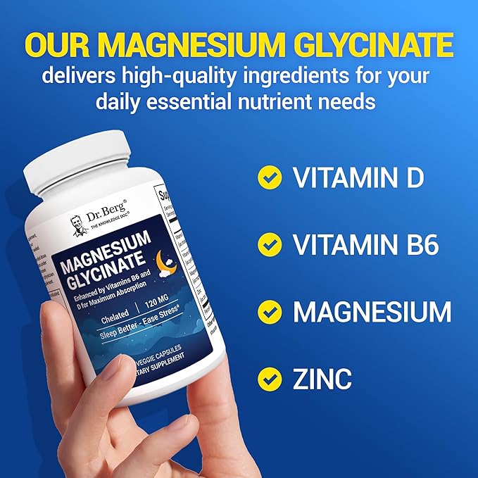 Dr. Berg Magnesium Glycinate with Vitamin D, B6 & Zinc for Stress Relief, Calm, Relaxation, & Good Sleep* - 120 mg Per Magnesium Supplement Capsule - Chelated Magnesium Glycinate - 150 Caps
