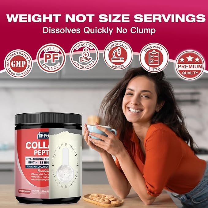 - ENHANCED BIOACTIVE ABSORPTION - DRFOSTER Hydrolyzed Collagen is broken down into smaller peptides for enhanced solubility and bioavailability. Plus, our collagen features Multivitamins and 18 amino acids that can help your body absorb more of the nutrient.