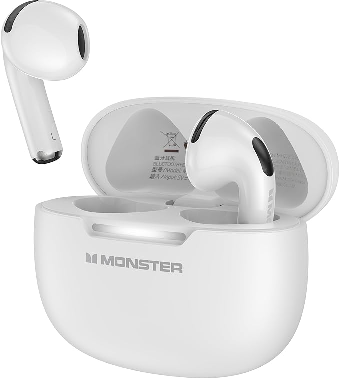 Monster N-Lite 208 Wireless Earbuds, Bluetooth Earbuds Touch Control, Headphones Bluetooth Wireless with 30H Playtime, Type-C Fast Charging, Clear Call, Comfortable Fit for Running, White