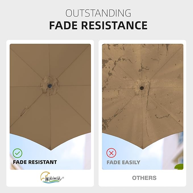 - EASY TO ADJUST: Open, close and tilt the umbrella with ease! Wikiwiki market umbrella is designed with a crank system for easy opening and quick use. Push button tilt allows for more angles of shade protection and allows for coverage all day.