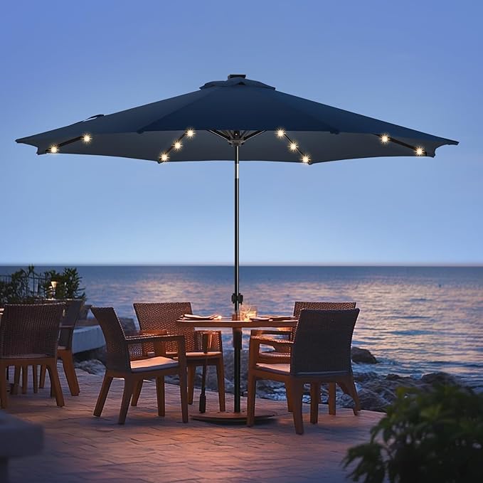wikiwiki 11ft Solar Led Patio Umbrella, Sturdy Outdoor Market Umbrella for Deck, Pool, Garden w/Tilt, Crank, 32 LED Lights, Navy Blue