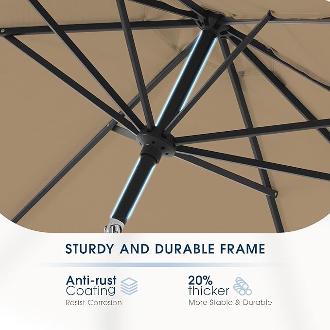 wikiwiki 9 FT Patio Umbrellas Outdoor Table Market Umbrella with Push Button Tilt/Crank, 8 Sturdy Ribs, Fade Resistant Waterproof POLYESTER DTY Canopy for Garden, Lawn, Deck, Backyard & Pool, Tan