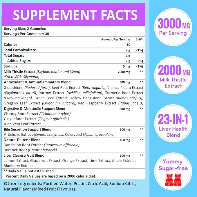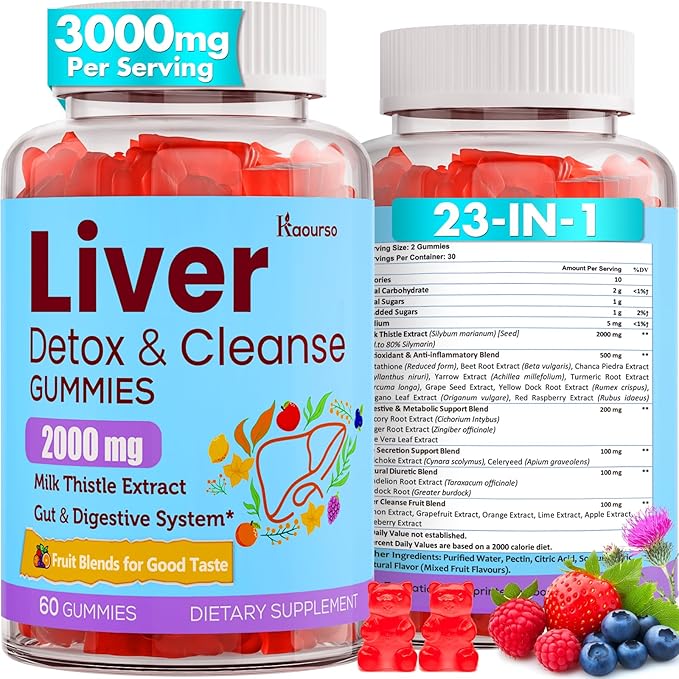 - Zero-Sugar, Effective & Delicious Daily Liver Detox Support: our 3000mg Liver Cleanse Detox & Repair Gummies is crafted with Zero-Sugar using fruit extract for natural sweetness, No Excess Calories. The natural fruit blends flavor makes taking your liver supplement a pleasant experience. With 60 gummies per bottle, each serving of 2 gummies provides a powerful dose of our 3000mg liver support blends, making it easy to incorporate into your daily routine