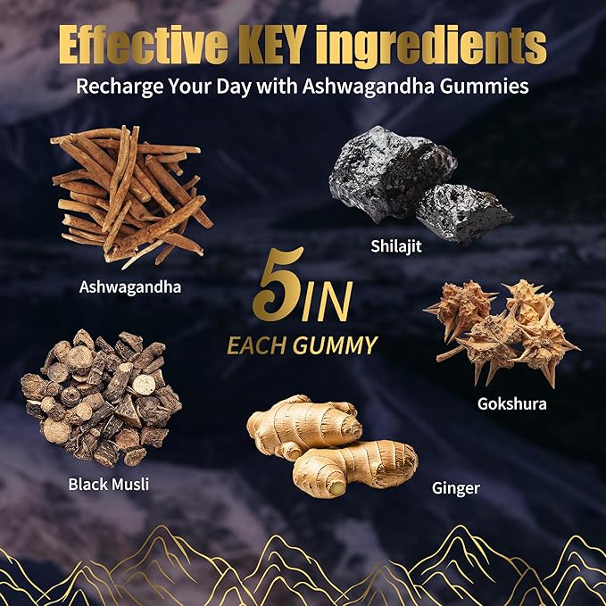 - Organic Gold Level Shilajit - Sourced from pristine heights of Himalayan Mountain above 18,000 ft. The Shilajit resin wild harvested at this altitude is the premium gold level which has higher content of nutrients. Our ashwagandha Gummies loaded with essential minerals and organic gold grade shilajit, making it a lifestyle that's all about balance and well-being.