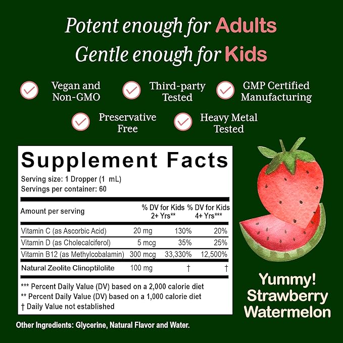 - KID-APPROVED FLAVOR: Our Kids Zeolite Detox supplement features a delightful strawberry watermelon flavor that kids absolutely love, making everyday a tasty and enjoyable experience! Shake well and drop drop drop!