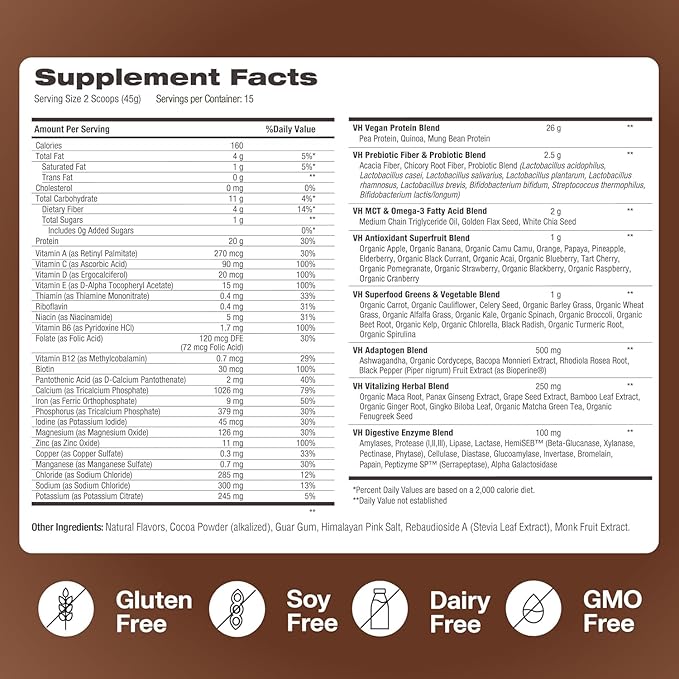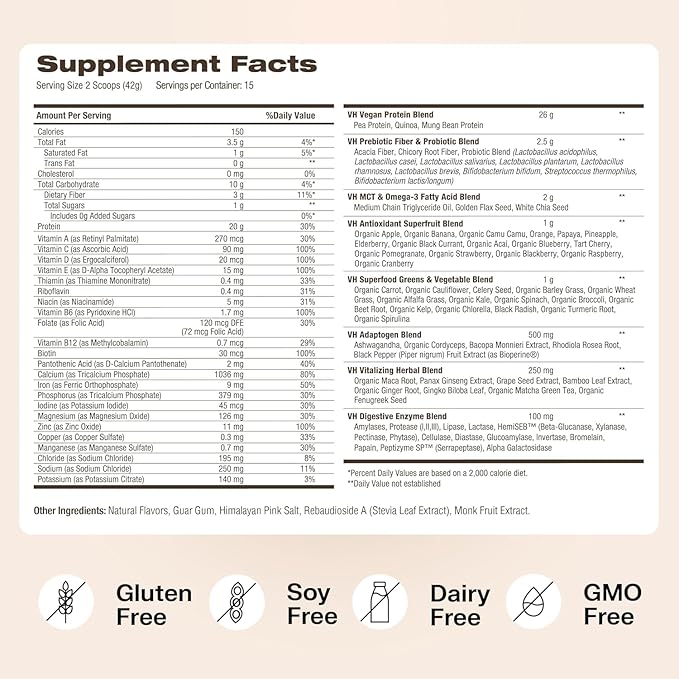 - MORE THAN A MEAL REPLACEMENT – An all-in-one vegan protein powder loaded with omega-3s, MCT, pre + probiotic fiber, adaptogens, digestive enzymes, electrolytes, functional mushrooms, clnically proven with 300 mg of KSM-66 ashwagandha, and more.