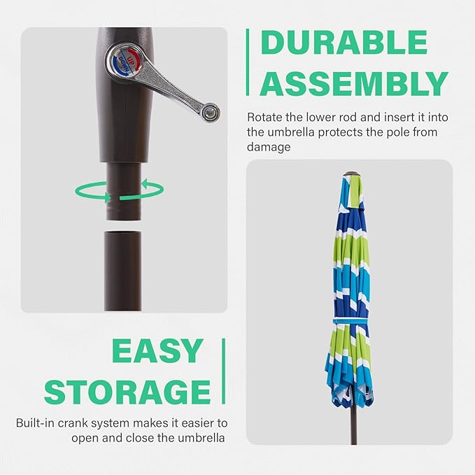 - EASY TO INSTALL&CONTROL: The crank lift mechanism of our patio umbrella makes it easy to open and close the table umbrella in seconds. You can also tilt the umbrella easily by pushing the button to block unwanted sun's rays at any angle