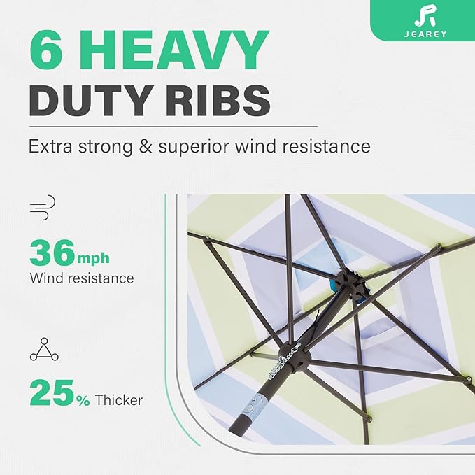 JEAREY 7.5FT Patio Umbrella Market Table Umbrella with 6 Sturdy Ribs, Push Button Tilt/Crank Outdoor Umbrella for Garden, Deck, Backyard, Pool and Beach,Bold Blue-Green Stripe