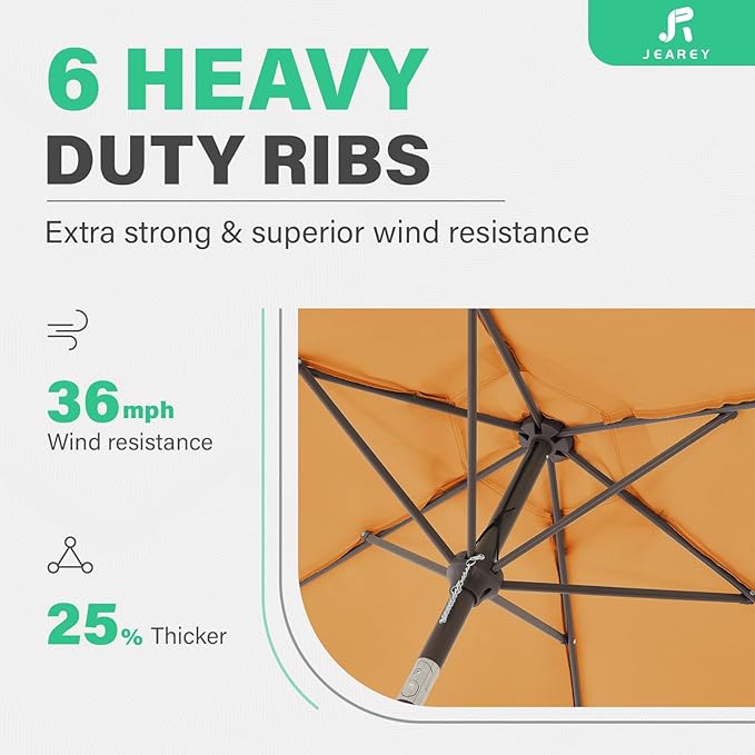 - WIDE APPLICABLE: JEAREY 7.5 ft diameter patio umbrellas for extra strength, featuring heavy-duty fabric is especially designed to keep you cool and comfortable. Our 7.5 feet outdoor umbrellas are perfect for table with 2 to 4 chairs, is a perfect and essential for summer or sunny day to shade sunshine
