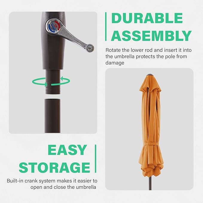 - EASY TO INSTALL&CONTROL: The crank lift mechanism of our patio umbrella makes it easy to open and close the table umbrella in seconds. You can also tilt the umbrella easily by pushing the button to block unwanted sun's rays at any angle