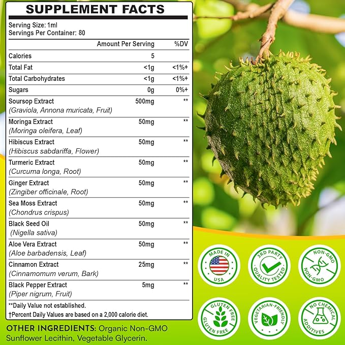 - Highest Potency Soursop Extract: With 500 mg of soursop extract per serving, our 880MG Soursop Bitters Liquid offers the highest potency on the market. Soursop Bitters Liquid with moringa, hibiscus, cinnamon, ginger, turmeric, aloe vera, sea moss, black seed oil, black pepper, each chosen for their synergistic health benefits. Combined with 9 natural organic herb/plant extracts, providing a comprehensive solution for Cell Support & Regeneration, Immunity, Liver, Gut, Zzz & Antioxidant