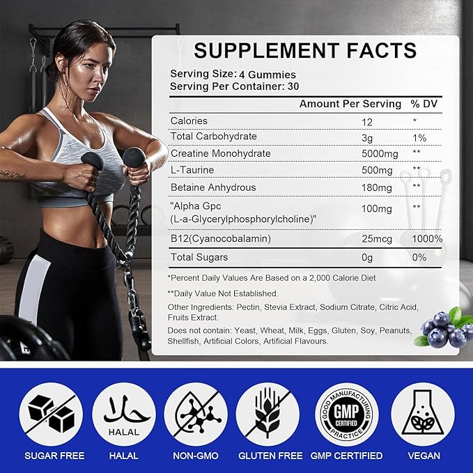 - Vegan, Gelatin Free, Sugar Free: Each bottle contains 120 vegan, non-GMO, gluten-free, sugar-free creatine monohydrate gummies, ensuring a clean and healthy product. They're super tasty! These fitness gummies are designed to align with your nutritional choices. Enjoy the benefits of our fitness gummies without compromising your principles or the quality of the ingredients you consume.