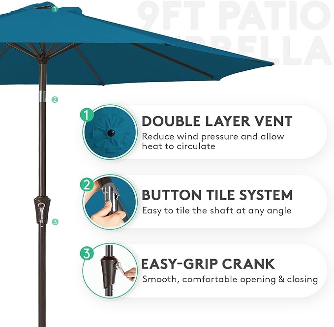 - MULTIFUNCTIONAL CANOPY: 9FT outdoor umbrella would shades you with at least 4-6 chairs and table, ideal for both residential and commercial location. High-density polyester is WATER & UV RESISTANT. Double-layer Vent enables essential wind and heat to ventilate and makes the umbrella remain stable and grounded