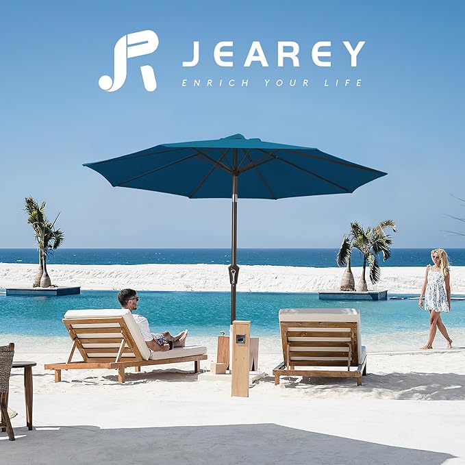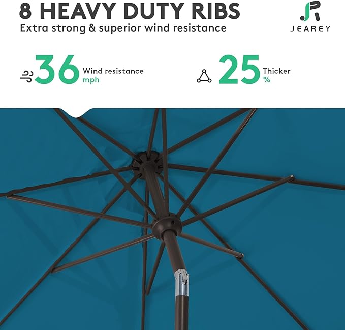 - STURDY & DURABLE: JEAREY always puts safety first. To reduce swaying and increase overall strength of our umbrella, the entire structure of yard umbrella is made of sturdy iron material. Powder coated iron pole and 8 sturdy ribs provides stronger support and are built for stability