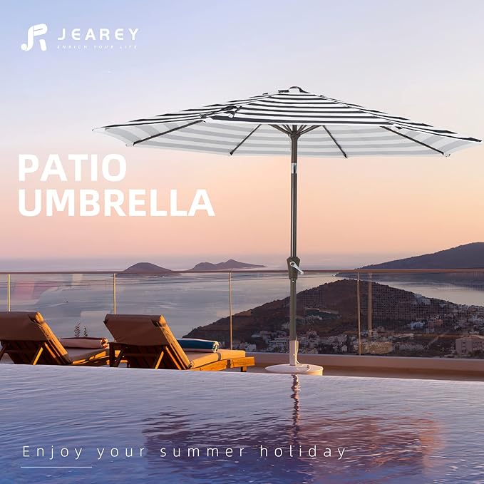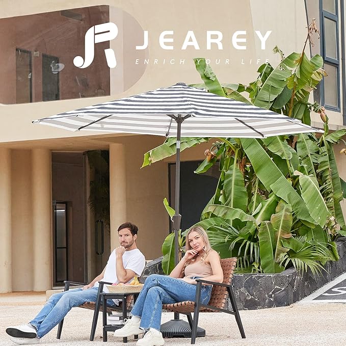- STURDY & DURABLE: JEAREY always puts safety first. To reduce swaying and increase overall strength of our umbrella, the entire structure of yard umbrella is made of sturdy iron material. Powder coated iron pole and 8 sturdy ribs provides stronger support and are built for stability