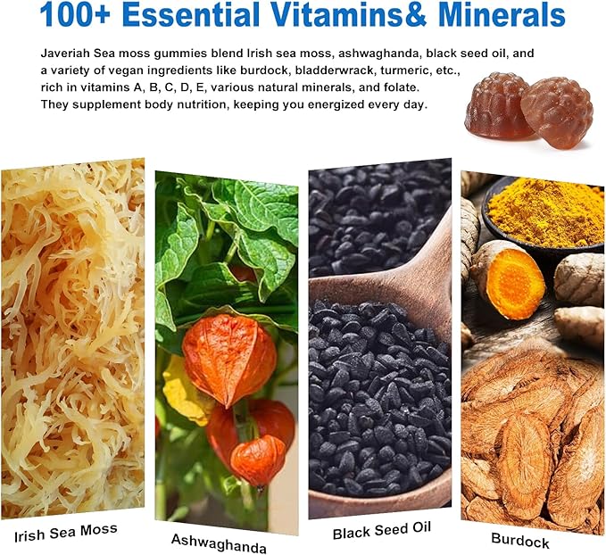 - Digestive & Skin Health : Rooted in constant innovation, Javeriah sea moss gummies contain black seed oil, bladderwrack Vitamin C, Vitamin D, Burdock and Ashwagandha which work synergistically to support the health and vitality of skin, digestive and cell Repair.