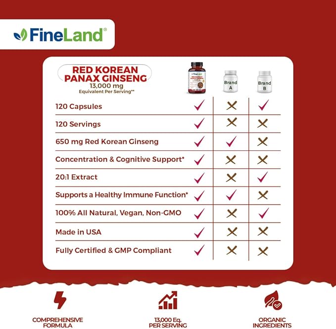FineLand Red Korean Panax Ginseng 20x Extract 13,000mg Eq. Per Capsule, 5% Ginsenosides!, Max Strength, Immune Support, Concentration & Cognitive Support, 120 Capsule, 4 Months Supply