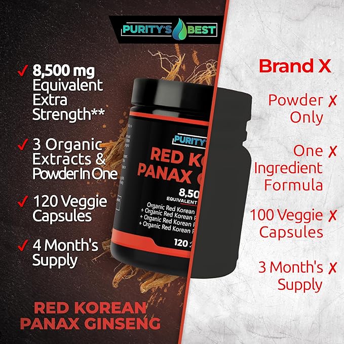 Purity’s Best RED Korean PANAX Ginseng Powder + 4X + 10x + 20x Extract, 8,500mg Eq. Per Serving, 5% Ginsenosides!, High Potency Ginsenosides for Energy, Concentration & Immune Support, 120 Capsules