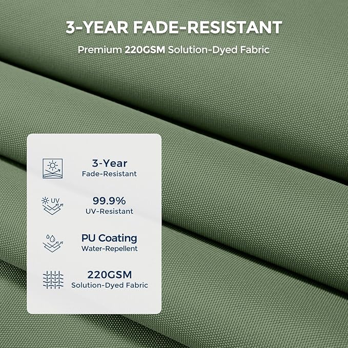 - PREMIUM CANOPY: High-quality 7.5ft 220gsm solution-dyed fabric with UPF50+ anti-UV coating provides 3-year fade-resistant, 99.9% UV-resistant, and water-repellant properties. Effectively blocks harmful UV rays including UVA and UVB to protect your health
