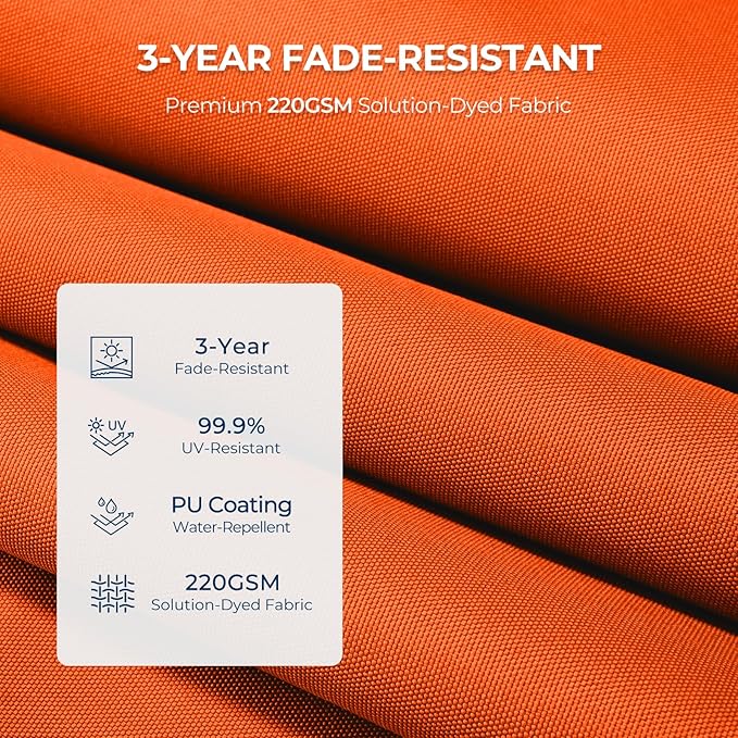 - PREMIUM CANOPY: High-quality 7.5ft 220gsm solution-dyed fabric with UPF50+ anti-UV coating provides 3-year fade-resistant, 99.9% UV-resistant, and water-repellant properties. Effectively blocks harmful UV rays including UVA and UVB to protect your health.