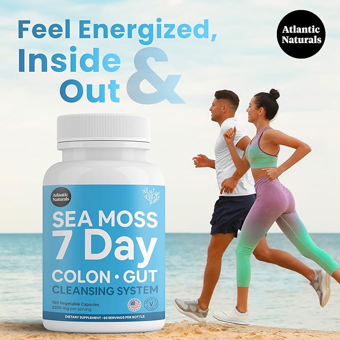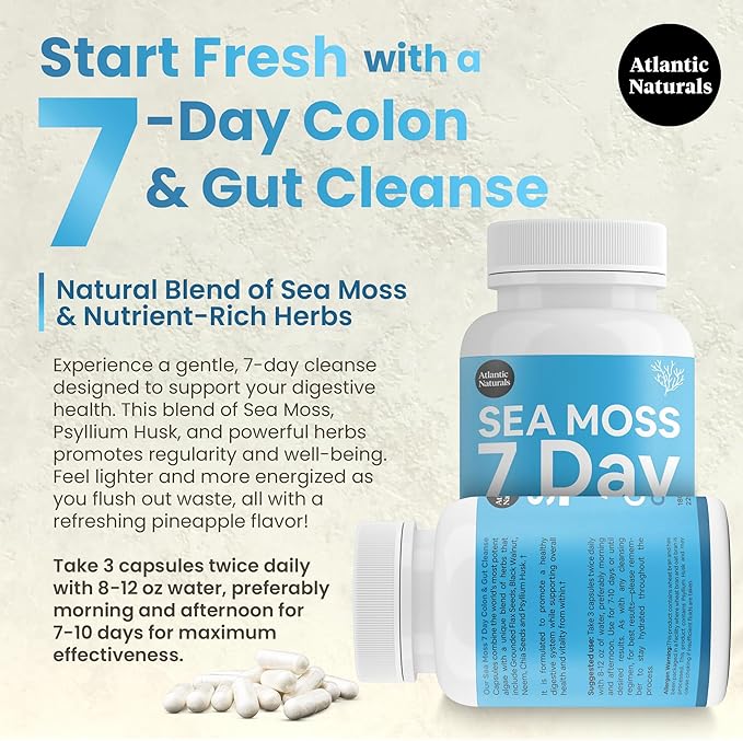 Atlantic Naturals - Sea Moss 7-Day Cleanse Colon & Gut Detox Capsule - Juice Cleanse Support with Psyllium Husk Senna Powder - Body Cleanse and Detox for Women & Men - 180 Sea Moss Capsules