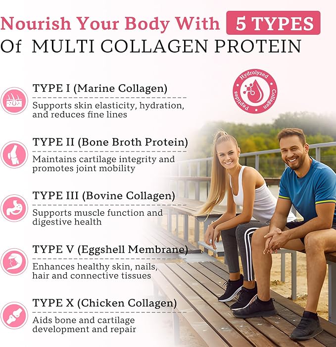 - Support Joint Health & Bone Strength: Multi-collagen supplements, all 5 types of collagen hydrolysate I, Il, Ill, V & X, are designed to promote joint comfort and strengthen bones. These biotin collagen keratin supplements support connective tissues, enhancing flexibility, reducing discomfort, and maintaining bone and joint integrity. Additionally, collagen gummies help build strong muscles, boost energy and metabolism, and support brain function for overall musculoskeletal and cognitive health