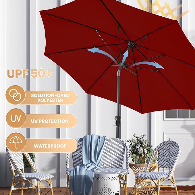 - 9FT LARGE CANOPY: This premium patio umbrella is equipped with a 180G 100% polyester canopy that's windproof, waterproof and fade-resistant, 97% UV protection, high-quality material can be used for many years. Air vented canopy at the top designed for air flow and prevent from inversion.