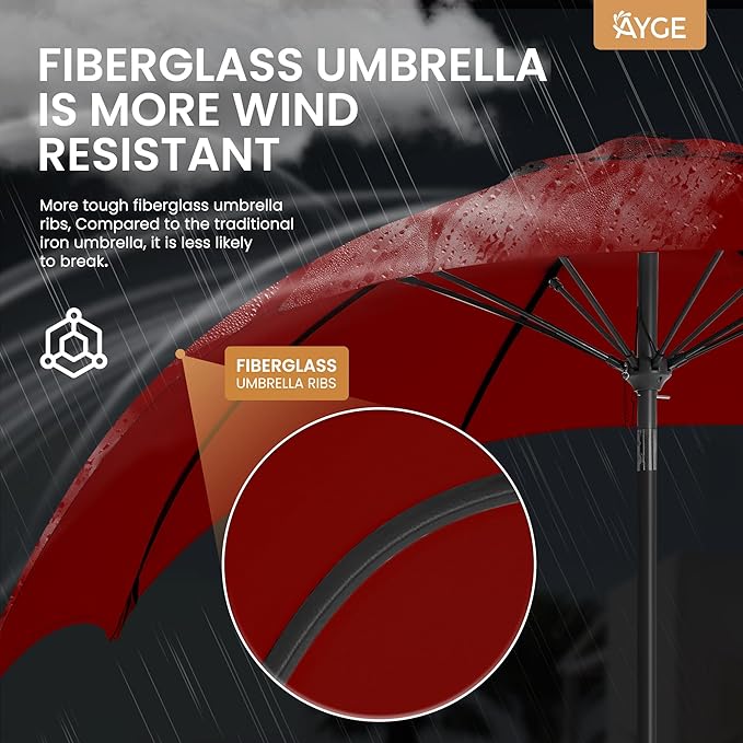 - HEAVY-DUTY UMBRELLA FRAME: The outdoor umbrella comes with 1.49 inches diameter steel pole coated combined with 8 fiberglass ribs to form a spacious top to provide strong stability. Fiberglass ribs are tougher than iron ribs and better able to withstand strong winds. Rust-free powder coated aluminum & iron pole and iron ribs provides superior strength support that resists wind better.