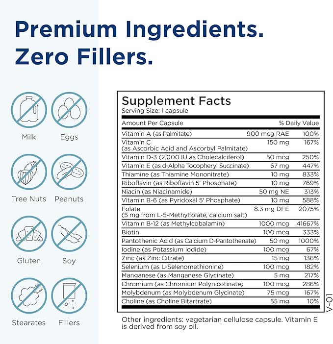 - Filler-Free Folate Supplements - Pure l methylfolate 5 mg with no bulking agents, stearates, brans, starches, glues, or binders. Womens and mens multivitamins made without gluten, dairy, eggs, and nuts.*