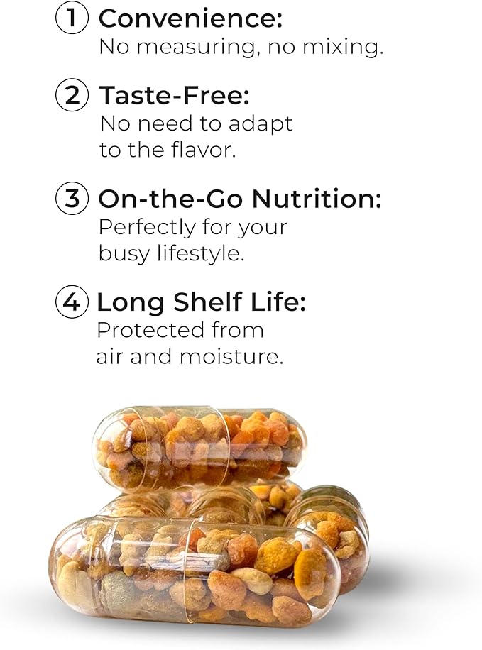 - Convenient Veggie Caps: Easy-to-swallow forms, perfect for kids and adults, ensuring a hassle-free supplement intake. Our bee superfood is not available in powder, chewables, gummies or tablet form