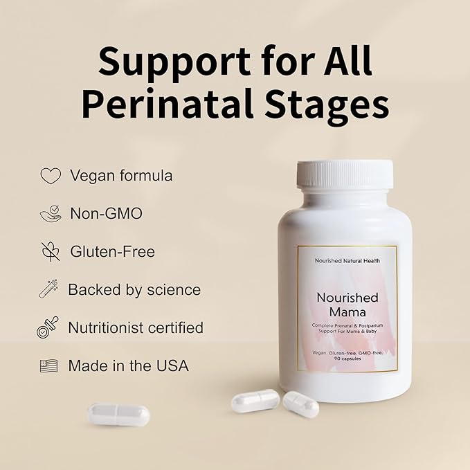 - PRENATAL SUPPORT - Nourished Mama is a meticulously formulated vegan vitamin supplement designed for all perinatal stages. 3 capsules a day can help prepare your body for conception and pregnancy, replenishing your nutrient stores and enhancing egg quality and ovulation. It supports baby's growth during pregnancy, nourishes mama during recovery, and even supports breastfeeding and lactation for those who choose to.