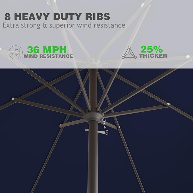 - Sturdy & Durable: This market umbrella is designed with crank open system for easy and quick use. The entire structure of yard umbrella is made of sturdy iron material. Powder coated iron pole and 8 sturdy ribs provides stronger support and are built for stability