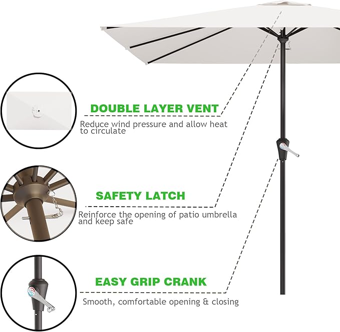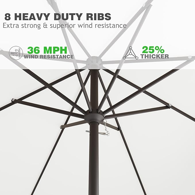- Sturdy & Durable: This market umbrella is designed with crank open system for easy and quick use. The entire structure of yard umbrella is made of sturdy iron material. Powder coated iron pole and 8 sturdy ribs provides stronger support and are built for stability