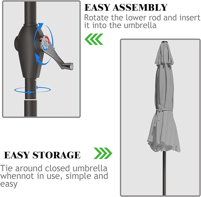 - CONVENIENT CRANK HANDLE - Adjusting the shade is simple with the crank-lift system. A few turns raises the canopy to the perfect height. Lowering is just as easy - no heavy lifting required. The tilt mechanism follows suit with an intuitive push-button design. A brief press angles the umbrella outdoor patio however you like. Find just the right shading whether seated or standing