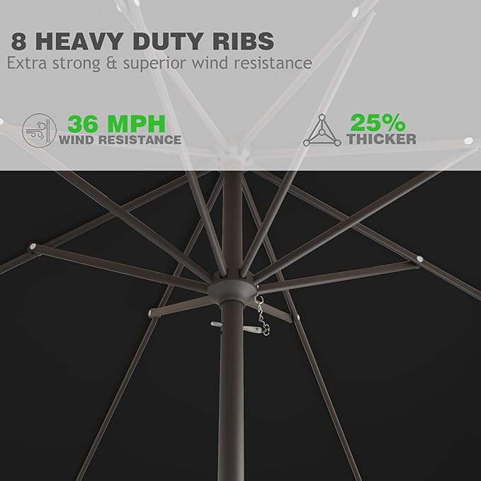 - Sturdy & Durable: This market umbrella is designed with crank open system for easy and quick use. The entire structure of yard umbrella is made of sturdy iron material. Powder coated iron pole and 8 sturdy ribs provides stronger support and are built for stability