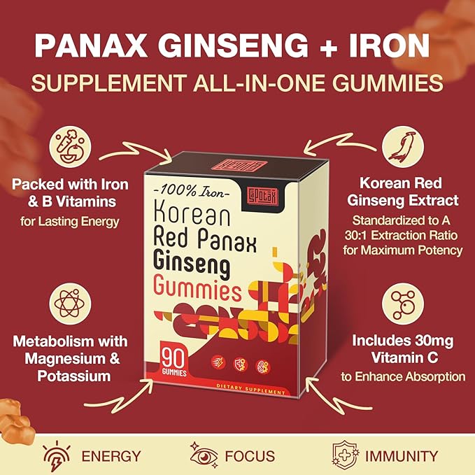 Korean Red Panax Ginseng Supplement Gummies - Iron Supplements for Women & Men - Iron Gummies with Vitamin C, B6, B12, Potassium & Magnesium, Vegan - 180 Count
