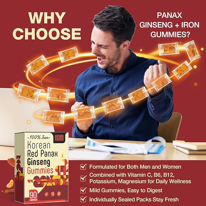 Korean Red Panax Ginseng Supplement Gummies - Iron Supplements for Women & Men - Iron Gummies with Vitamin C, B6, B12, Potassium & Magnesium, Vegan - 90 Count
