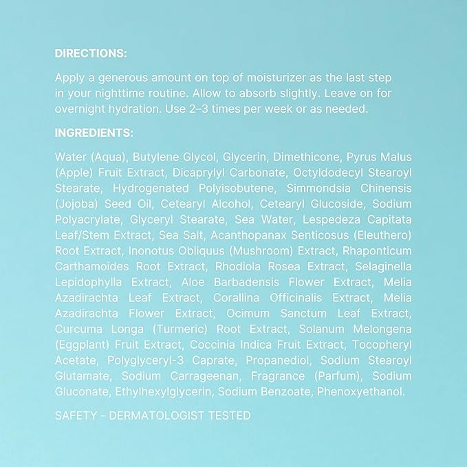 - Bioadaptive Botanicals: Infused with a blend of adaptogens including Rhodiola, Maral Root, Siberian Ginseng, and Chaga Mushroom, this mask helps your skin adapt and bounce back from daily Issues.