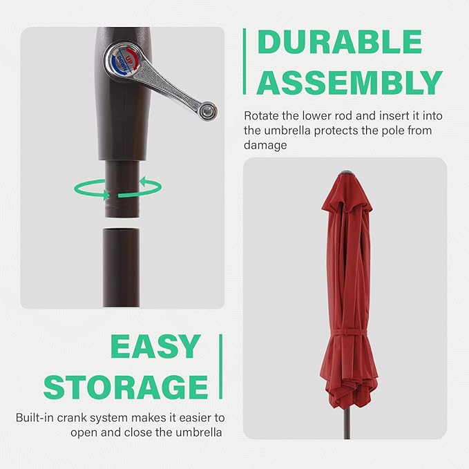 - EASY TO INSTALL&CONTROL: The crank lift mechanism of our patio umbrella makes it easy to open and close the table umbrella in seconds. You can also tilt the umbrella easily by pushing the button to block unwanted sun's rays at any angle