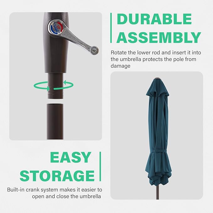 - EASY TO INSTALL&CONTROL: The crank lift mechanism of our patio umbrella makes it easy to open and close the table umbrella in seconds. You can also tilt the umbrella easily by pushing the button to block unwanted sun's rays at any angle