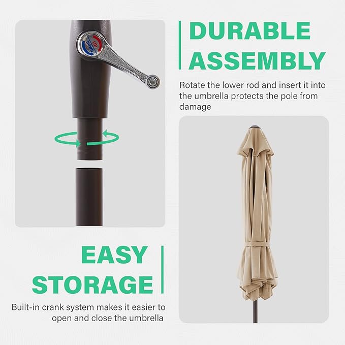 - EASY TO INSTALL&CONTROL: The crank lift mechanism of our patio umbrella makes it easy to open and close the table umbrella in seconds. You can also tilt the umbrella easily by pushing the button to block unwanted sun's rays at any angle