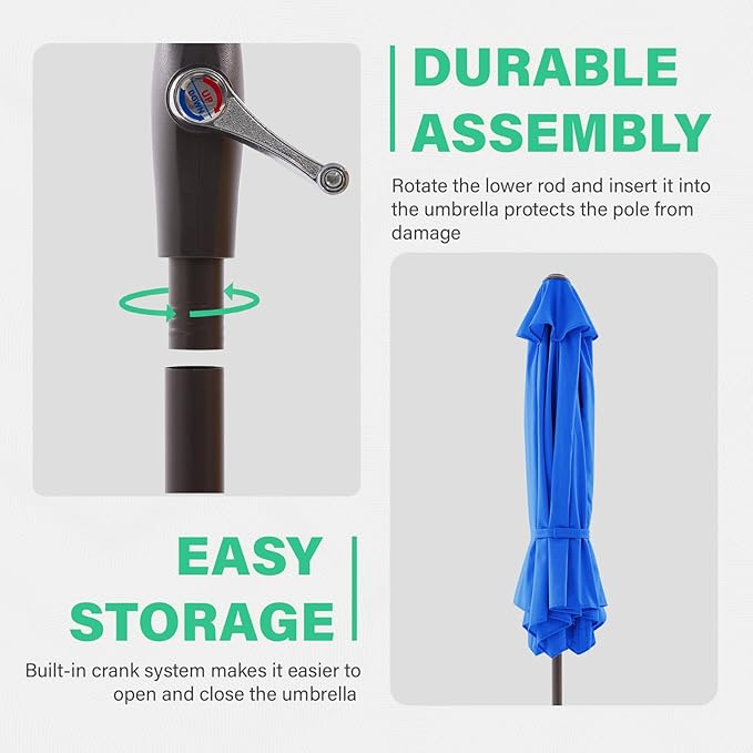 - EASY TO INSTALL&CONTROL: The crank lift mechanism of our patio umbrella makes it easy to open and close the table umbrella in seconds. You can also tilt the umbrella easily by pushing the button to block unwanted sun's rays at any angle