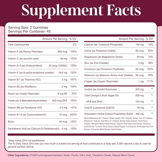 - Hair, Skin & Energy Boost: This daily women’s multivitamin gummy features 150mcg Biotin, 200mg Inositol, and essential B-Vitamins (including B1, B2, B6, and B12) to support healthy hair and skin, support energy metabolism, and enhance mental clarity. Designed to help women feel good and energized every day, these berry flavored gummies are the perfect addition to your wellness routine