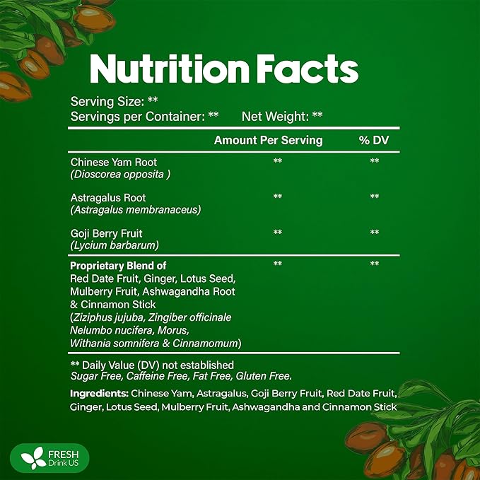 • ☘️ 100% NATURAL INGREDIENTS: Chinese Yam Root, Astragalus Root, Goji Berry Fruit, Red Date Fruit, Ginger, Lotus Seed, Mulberry Fruit, Ashwagandha Root, Cinnamon Stick. We source the finest natural herbs to create our tea, made without additives or artificial flavors, ensuring you receive a pure and authentic taste.
