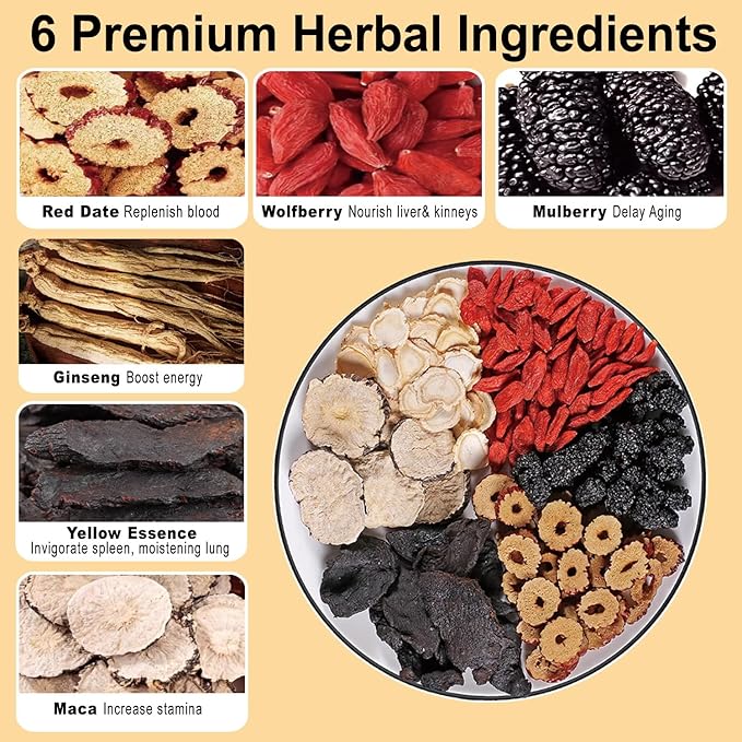 - Natural Herbal Ingredients: Ginseng Five Treasures Tea combines the health benefits of ginseng, goji berries, maca, yam, red dates, and yellow essence. This Kidney Cleanse Tea is made with all-natural herbal extracts, carefully processed through low-temperature roasting and grinding, ensuring purity without any additives.