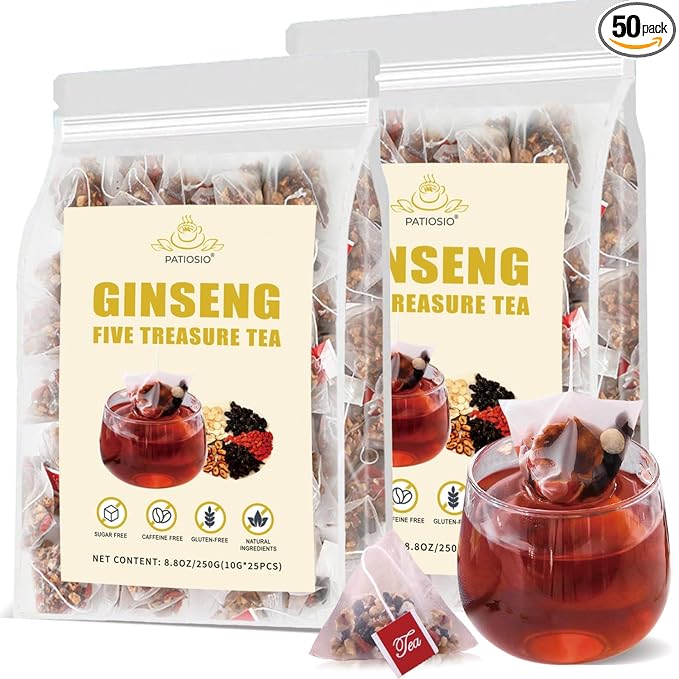 Ginseng Five Treasures Tea Kidney Tea- Wubao Tea Ginseng Six Treasure Tea, Ginseng Red Date Chinese Herbal Tea, Kidney Cleanse Detox Tea for Men & Women (2 Pack(50 pcs))