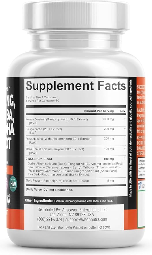 • The Ultimate Ashwagandha Capsules & Ginseng Capsules You've Been Looking For - Clean Nutra Ginkseng provides 4 full-dose products in one for support containing a full ginkgo biloba supplements, korean ginseng extract, ashwagandha extra strength, and maca pills in a convenient 2 capsule dosage! Finally, gingko biloba supplements with red ginseng korean, ashwagandha pills and maca capsules have been packed into one convenient solution.