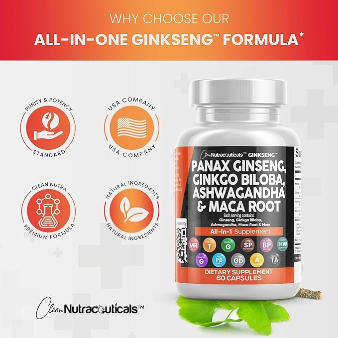 • A Powerful Mood Support Supplement - Ginkseng is overflowing with potent vitamins and stress supplements such as panax ginseng capsules, ginko leaf extract, ashwagandha supplement, and maca supplement. Clear out the countless ginseng supplement, maca root capsules for men, ashwagandha 1000mg, and ginko biloba leaves in your cabinet and replace it with just one inclusive memory support supplements from Clean Nutraceuticals.