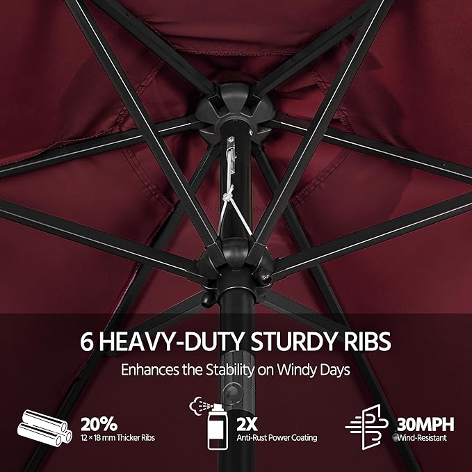 - Strong & Stable: This patio umbrella consists of a 7.5ft canopy made of water-resistant polyester, 6 metal ribs and an anti-rust powder-coated metal pole with a 1.5” diameter. A wind-vented canopy enhances the stability of the umbrella on windy days